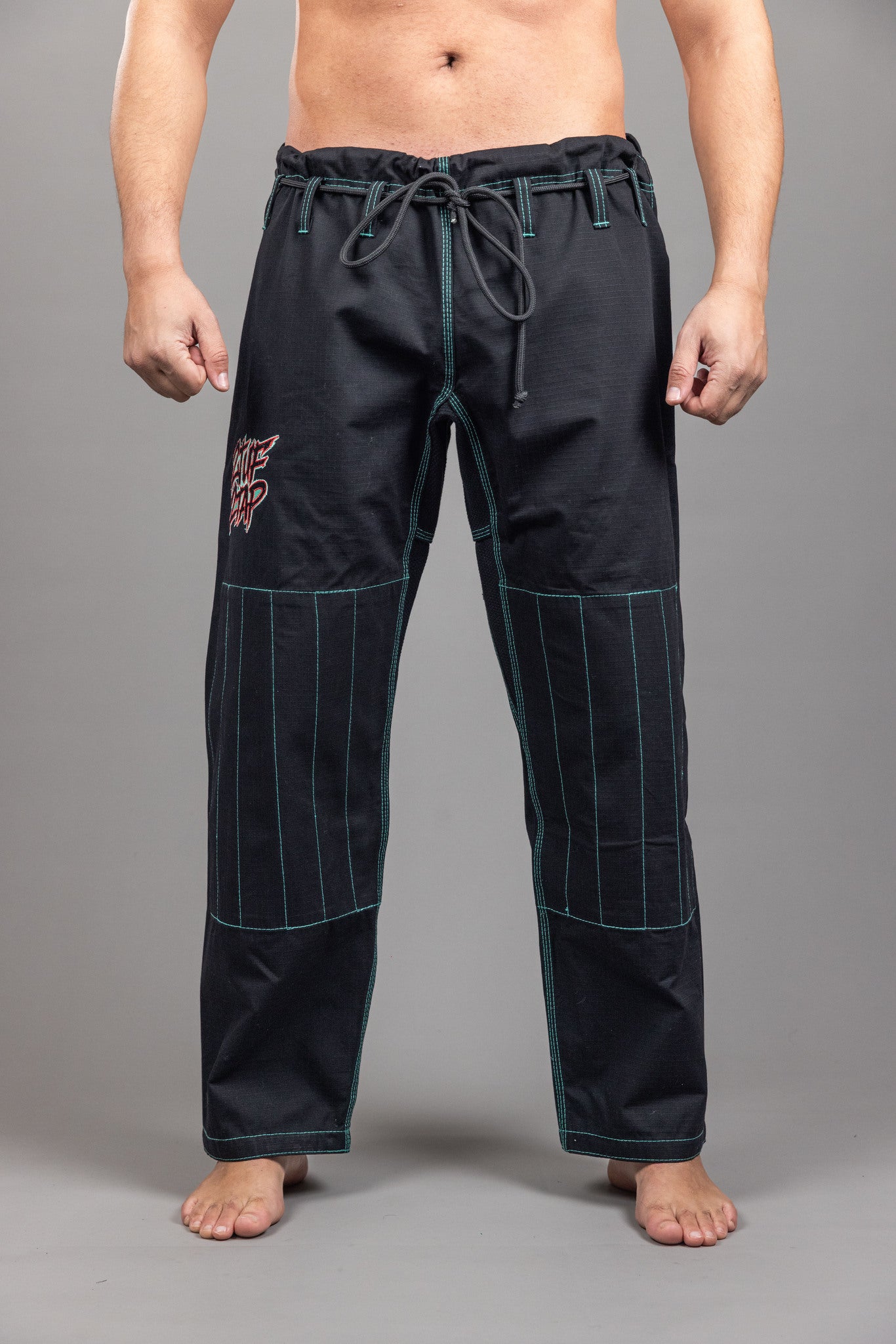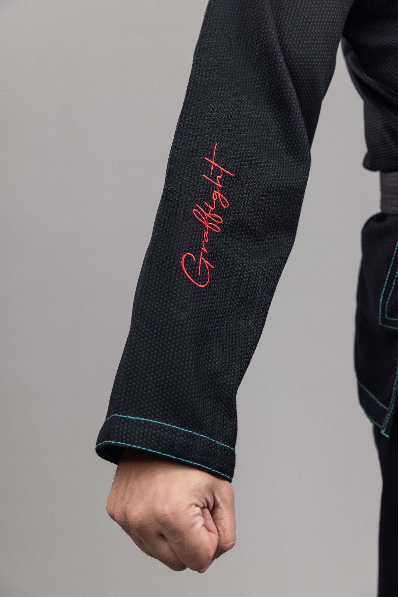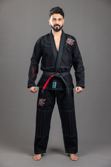 The Graffight is a bold, modern gi designed for practitioners who want their uniform to reflect both attitude and performance. Constructed from 450-gram pearl weave cotton, it delivers durability and breathability, ensuring comfort during intense training and competition. Its striking black base with teal stitching and red embroidered accents makes it a standout piece on the mats.