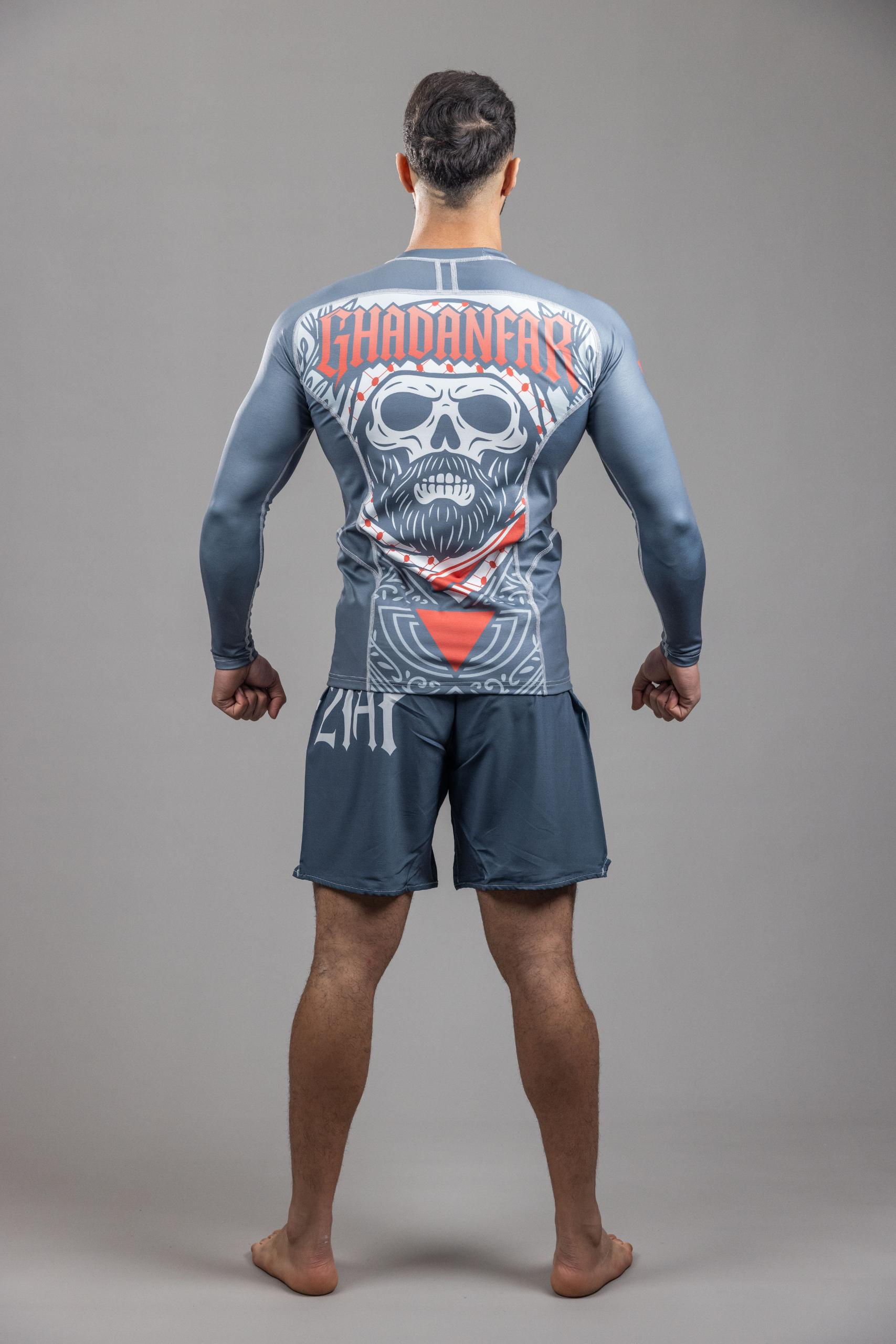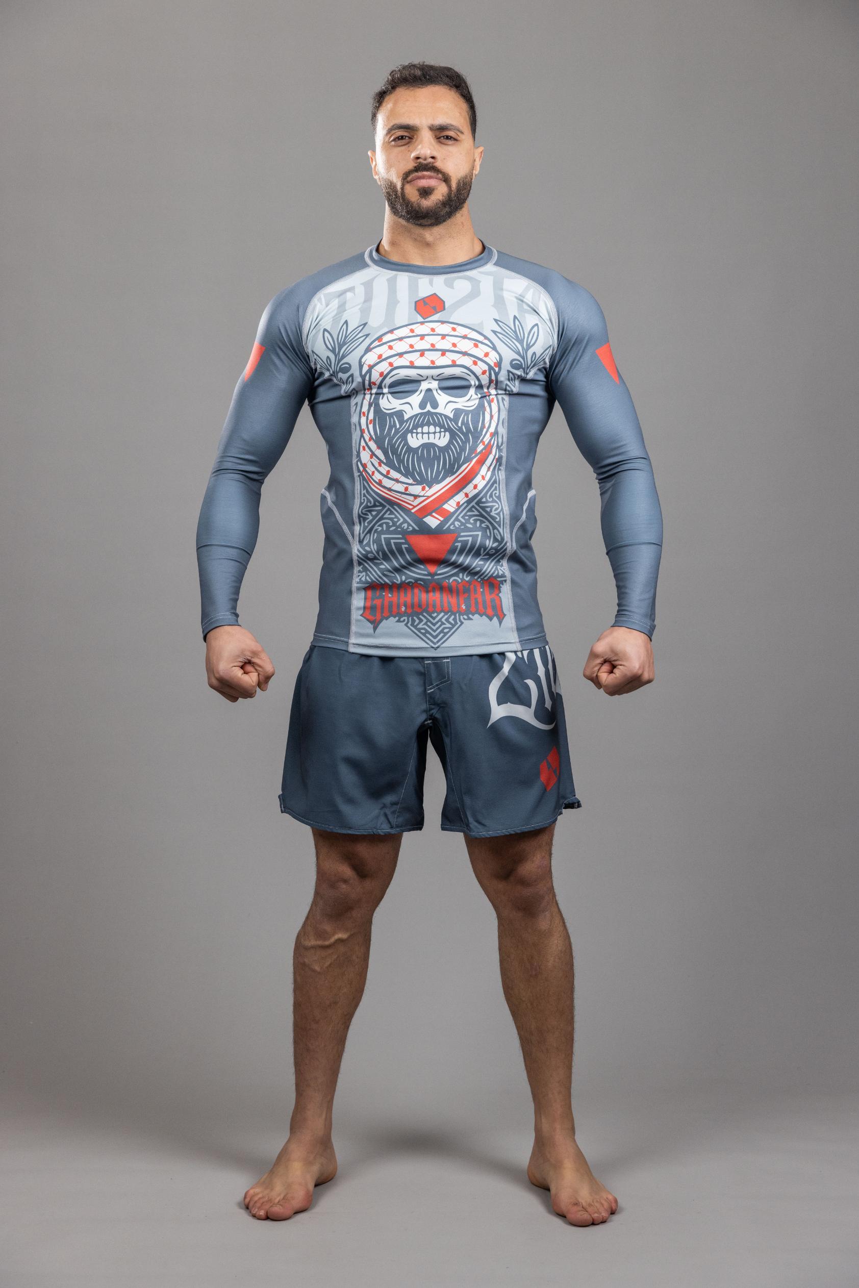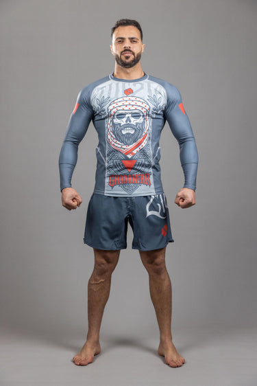 The Ghadanfar Rash Guard Top is a bold fusion of heritage, strength, and modern performance. Designed for athletes who want their gear to make a statement, it’s crafted from high-stretch, moisture-wicking fabric that keeps you cool, supported, and protected during grappling, MMA, or fitness training. Its striking design features a powerful skull motif framed by a red-and-white keffiyeh pattern, symbolizing resilience and identity, with the name GHADANFAR emblazoned across the chest.
